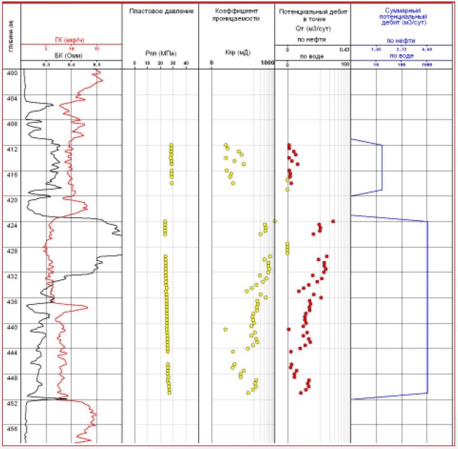 - построение профиля пластового давления и проницаемости по разрезу с целью выделения зон АВПД, АНПД в разведочных скважинах, выработанных зон с пониженным пластовым давлением и зон прорыва нагнетаемых вод в эксплуатационных скважинах;