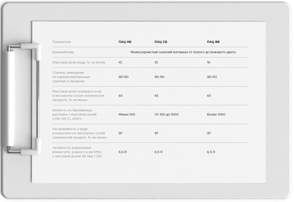 Производятся следующие марки полианионной целлюлозы: ПАЦ НВ, ПАЦ СВ, ПАЦ ВВ.