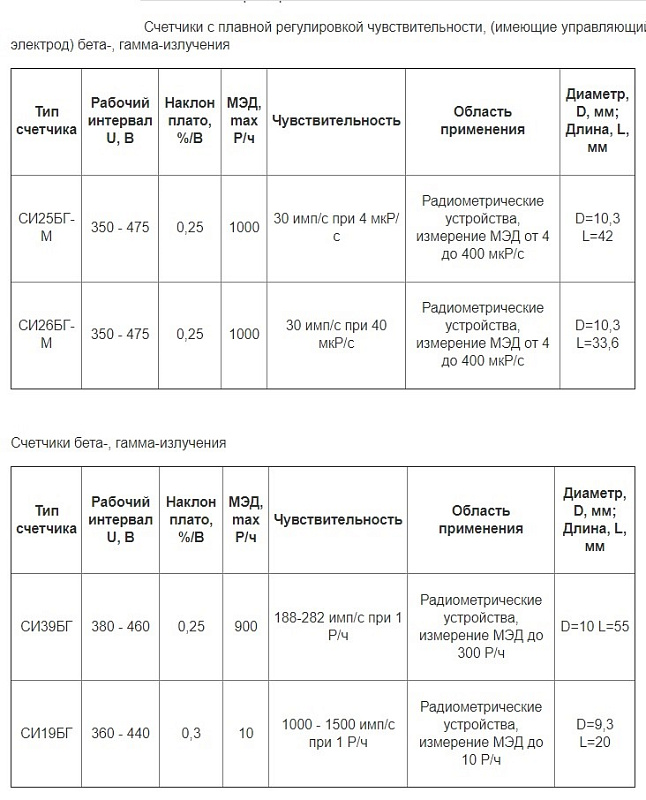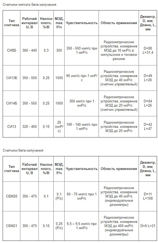 Счетчики ионизирующих излучений предназначены для использования в радиометрических устройствах, регистрирующих и измеряющих мощность экспозиционной дозы (МЭД) в диапазоне от единиц мкР/с до 1000 рентген в час.