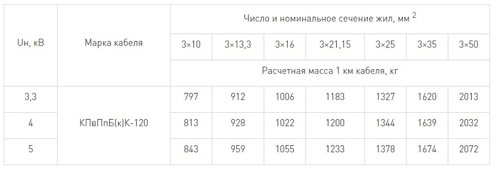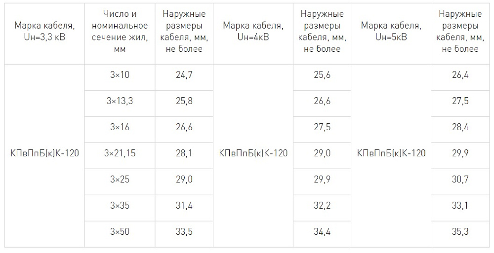 Кабель с медными жилами, с комбинированной изоляцией из радиационно-модифицированного полиэтилена высокой плотности и блоксополимера пропилена с этиленомпредназначенный для подачи электрической энергии к электродвигателям установок добычи нефти на номинальное переменное напряжение 3,3,4 и 5 кВ.
