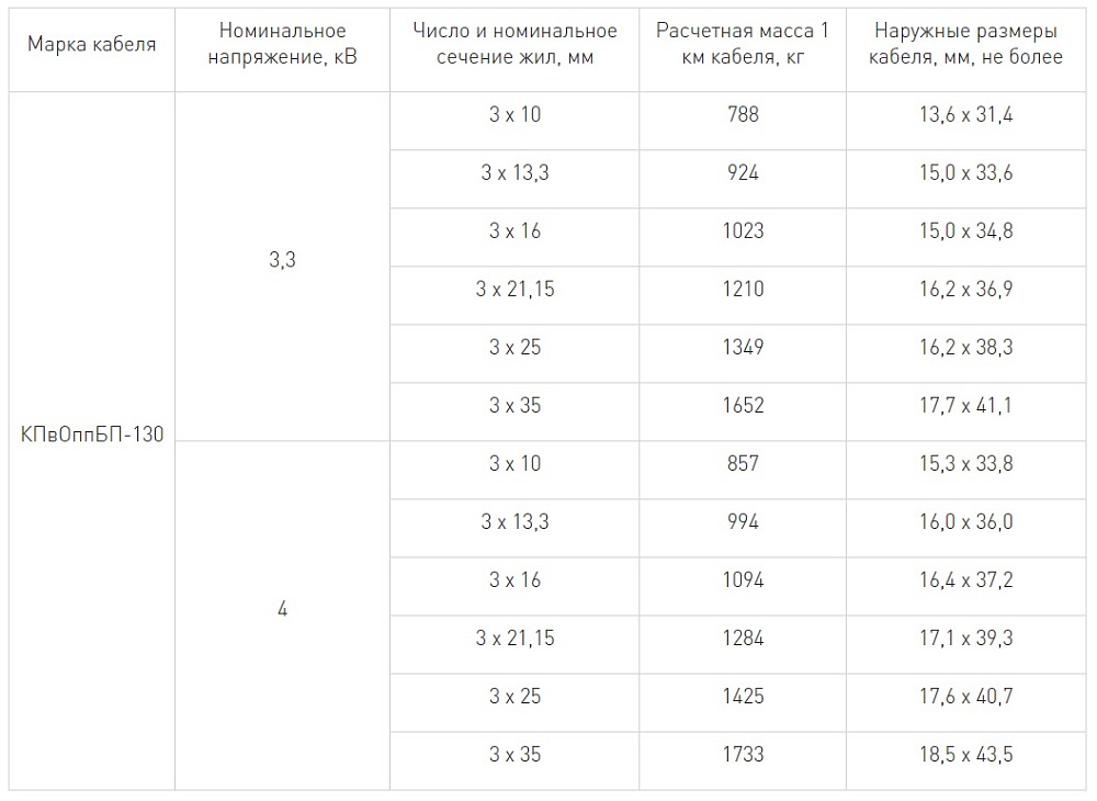 Кабель КПвОппБП-130 с изоляцией из радиационно-модифицированного полиэтилена в общей оболочке из блоксополимера пропилена с этиленом предназначенный для подачи электрической энергии к электродвигателя установок добычи нефти на номинальное напряжение 3,3 и 4,0 кВ частоты до 70 Гц.