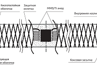 Рабочий элемент представляет собой проволоку, выполненную из титана, с нанесенным малорастворимым смешанным металлооксидным покрытием. Рабочий элемент электрически подсоединяется к токопроводу через контактный узел с постоянным шагом. Токопровод с рабочим элементом расположены в коксовой засыпке и покрыты кислотостойкой оболочкой и защитной оплеткой.