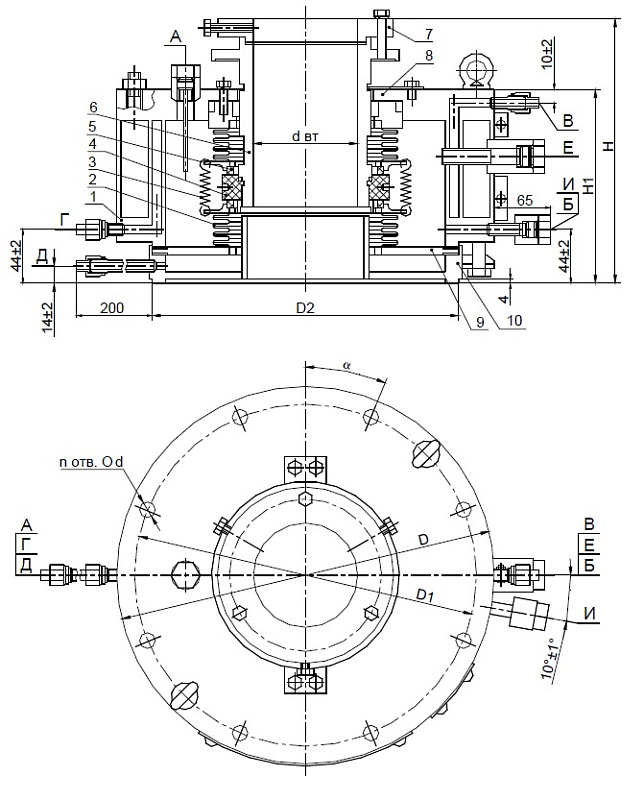 Уплотнение – с термическим затвором; состоит из корпуса, основания, подвижного и неподвижных уплотнительных колец, входящих в подпятник, и пружин, обеспечивающих контакт неподвижных и подвижного уплотнительных колец. Подвижное кольцо навернуто на втулку, вращение которой передается от вала через водило. Сильфон подпятника служит для разделения запирающей среды и атмосферы.