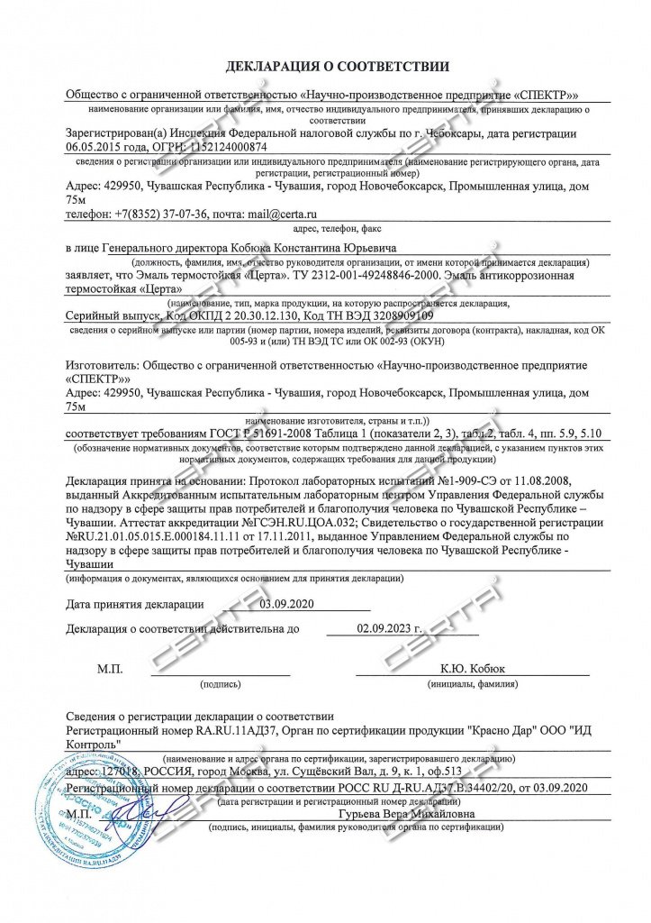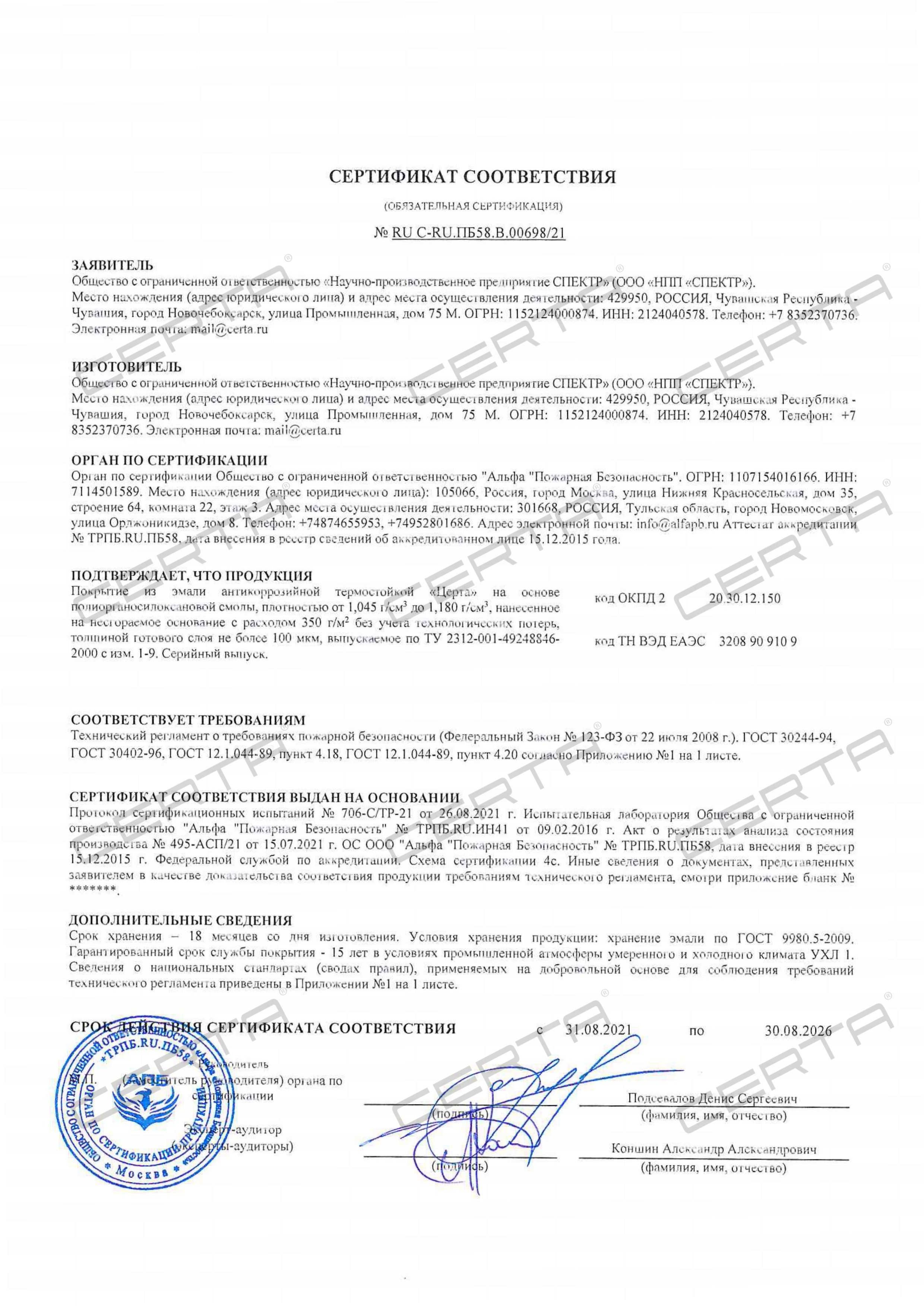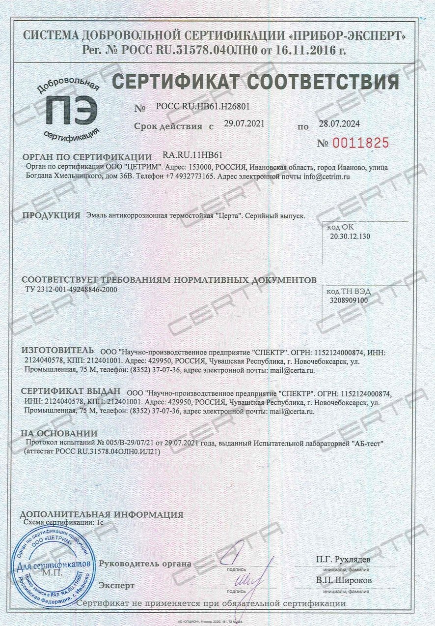 Формула CERTA на кремнийорганической основе сохраняет паропроницаемость, защищает от коррозии, выдерживает нагрев до +1200 °С, химическое воздействие растворами солей, минеральных масел, нефтепродуктов (после термозакалки).
