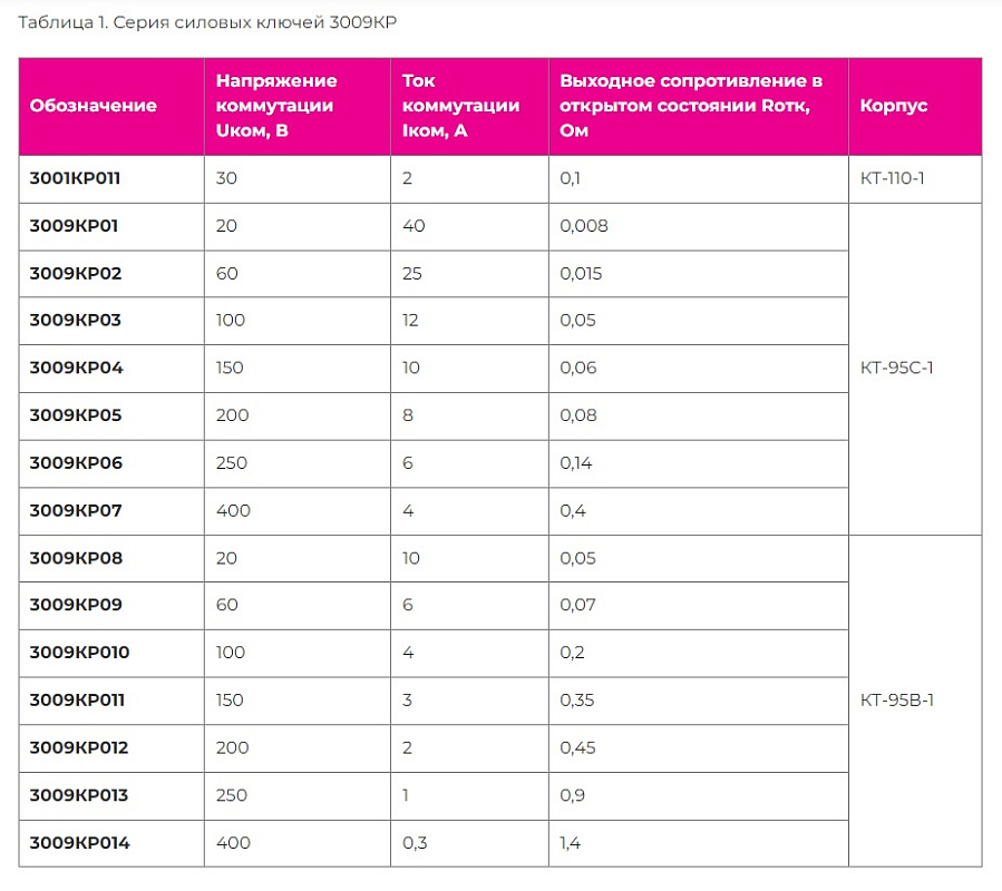 Имея высокую радиационную стойкость и низкое тепловыделение, силовые ключи 3009КР могут быть использованы в широком спектре устройств, применяемых в промышленности и экстремальных условиях Космоса и Арктики: